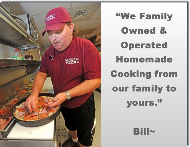 At Dough Licious, Bill creates his own special recipes, which includes scrumptious homemade meatballs, wicked good chicken tenders cooked to melt in your mouth made from fresh chicken breasts and dipped into a secret signature batter! Mouth watering homemade pizza and spaghetti sauce. Our dough is made right on the premises. Veggies are sliced daily for the freshest crisp salads, subs and pizzas, wraps & pockets, and tuna subs on demand not scooped from a bin made hours earlier. Other delicacies include perfect calzones and pasta dishes!